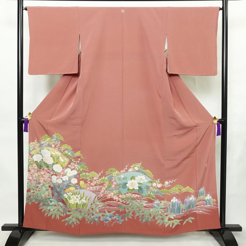 色留袖 阿部佳雪 落款入り 縮緬 一つ紋付き 正絹 花柄 袷仕立て 身丈159.5cm 裄丈65cm リサイクル着物 着物 共八掛 結婚式 フォーマル 菖蒲 松 菊 ピンクです。しなやかな風合いとなっております。