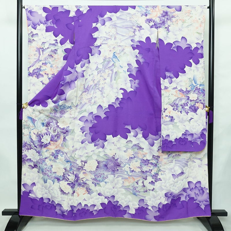 振袖 正絹 花柄 袷仕立て 身丈161cm 裄丈66cm リサイクル着物 着物 銀彩 成人式 二十歳 二十歳の集い フォーマル 紫・藤色です。滑らかな風合いとなっております。