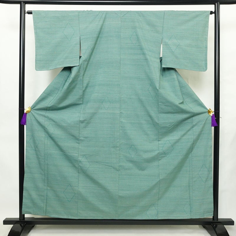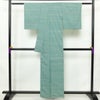紬 しつけ糸付き 正絹 幾何学柄・抽象柄 袷仕立て 身丈157cm 裄丈64cm リサイクル着物 着物 緑・うぐいす色