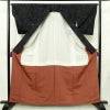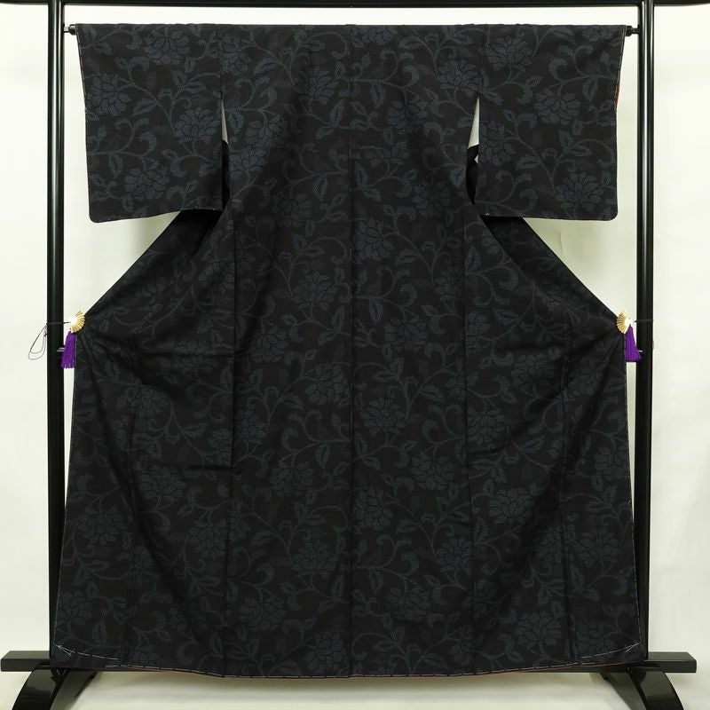 紬 良品 しつけ糸付き 正絹 木の葉・植物柄 袷仕立て 身丈161cm 裄丈65cm リサイクル着物 着物 モダン 黒です。ざっくりとした風合いとなっております。