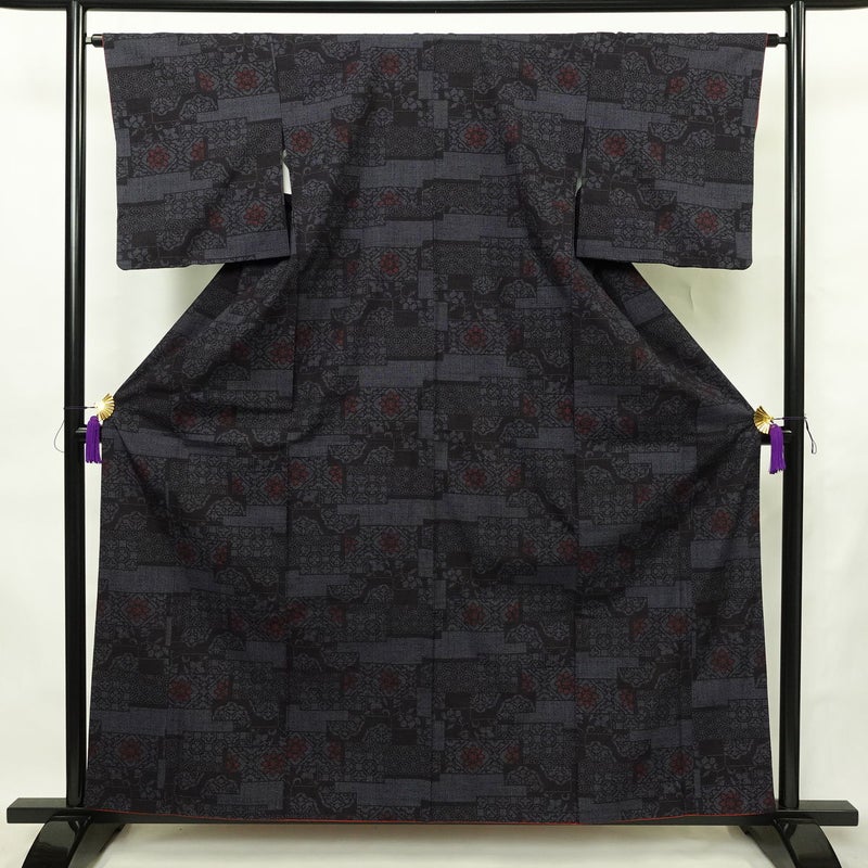紬 良品 正絹 幾何学柄・抽象柄 袷仕立て 身丈159.5cm 裄丈63.5cm リサイクル着物 着物 モダン 青・紺です。ざっくりとした風合いとなっております。