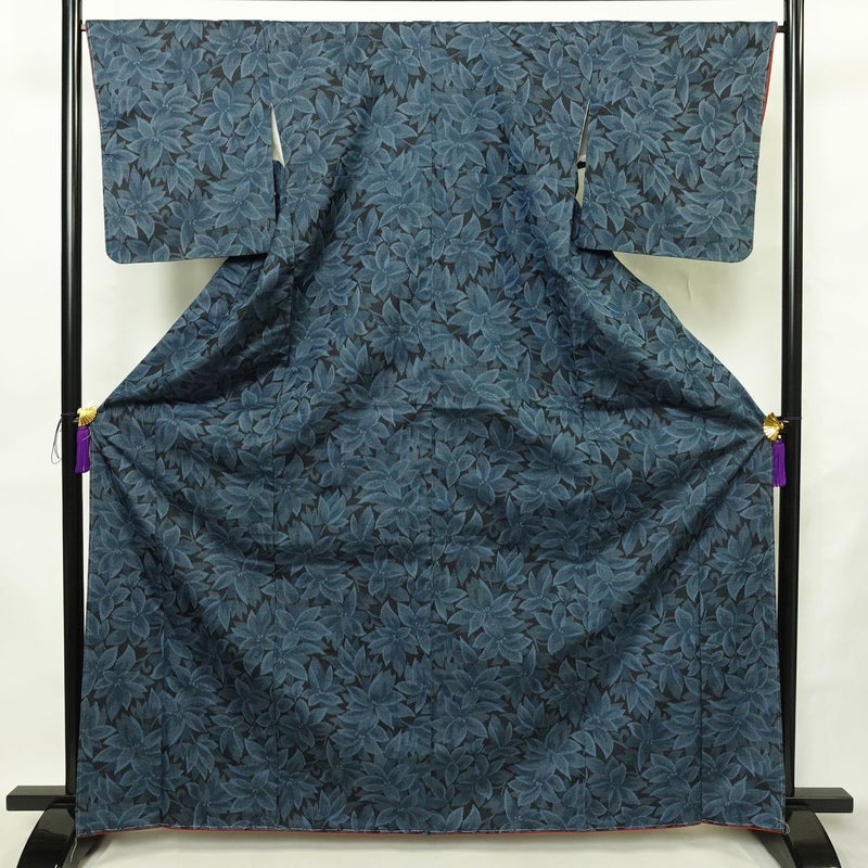 紬 良品 しつけ糸付き 正絹 木の葉・植物柄 袷仕立て 身丈166.5cm 裄丈66cm リサイクル着物 着物 青・紺