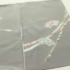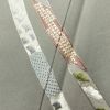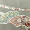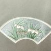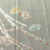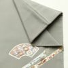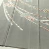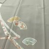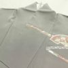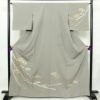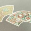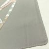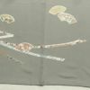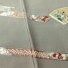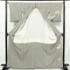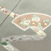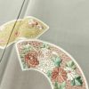 スワトウ刺繍が施された縮緬の訪問着。古典柄の扇面や紅葉、菖蒲、松、菊が上品な雰囲気を演出し、グレーの柔らかな色彩が品格を添えます。共八掛となっており、フォーマルな場や特別な場にふさわしい華やかな一着です。