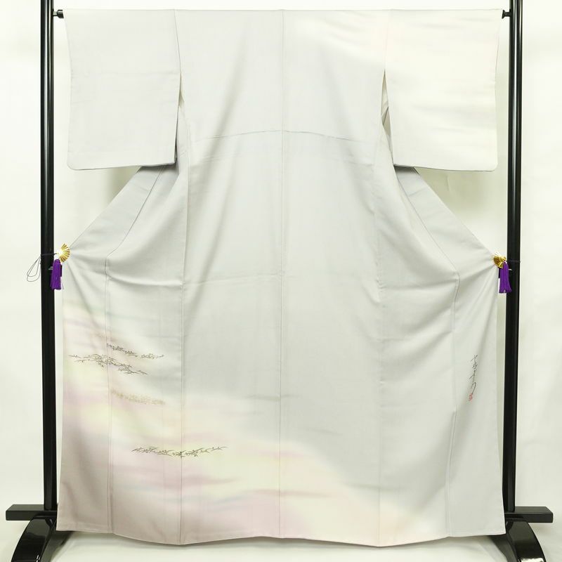 訪問着 良品 中嶋まさひろ 落款入り 正絹 木の葉・植物柄 袷仕立て 身丈164.5cm 裄丈65cm リサイクル着物 一部しつけ糸付き 着物 箔 入学式 卒業式 七五三 お宮参り フォーマル シンプル 上品 青・紺です。しなやかな風合いとなっております。