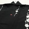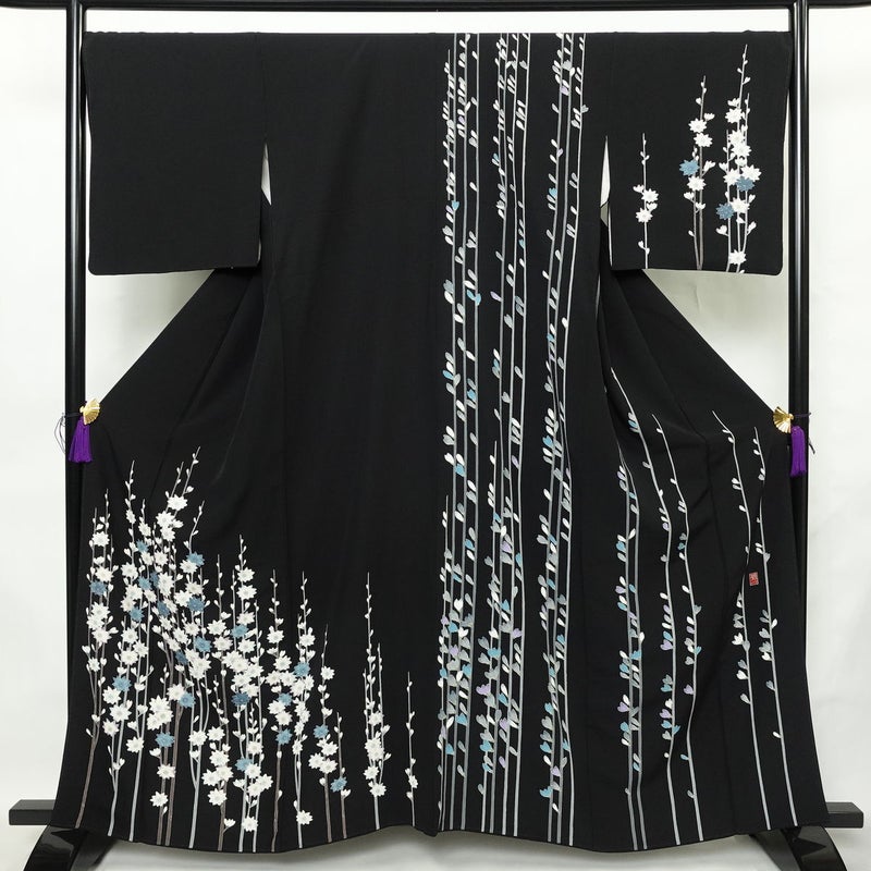 訪問着 小宮山彌一 落款入り 縮緬 正絹 花柄 袷仕立て 身丈160.5cm 裄丈69.5cm リサイクル着物 着物 卒業式 ゆったりサイズ パーティー フォーマル 黒です。しなやかな風合いとなっております。