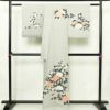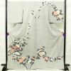 グレー地に芍薬や菊の花柄を豪華にあしらった一つ紋付き訪問着です。正絹ならではのしなやかな風合いで、着心地がよく優雅な印象を与えます。身丈167cm、裄丈66cmの標準サイズで共八掛付き。リサイクル品ですが状態良好で、結婚式やパーティーなどフォーマルな場に最適な一枚です。