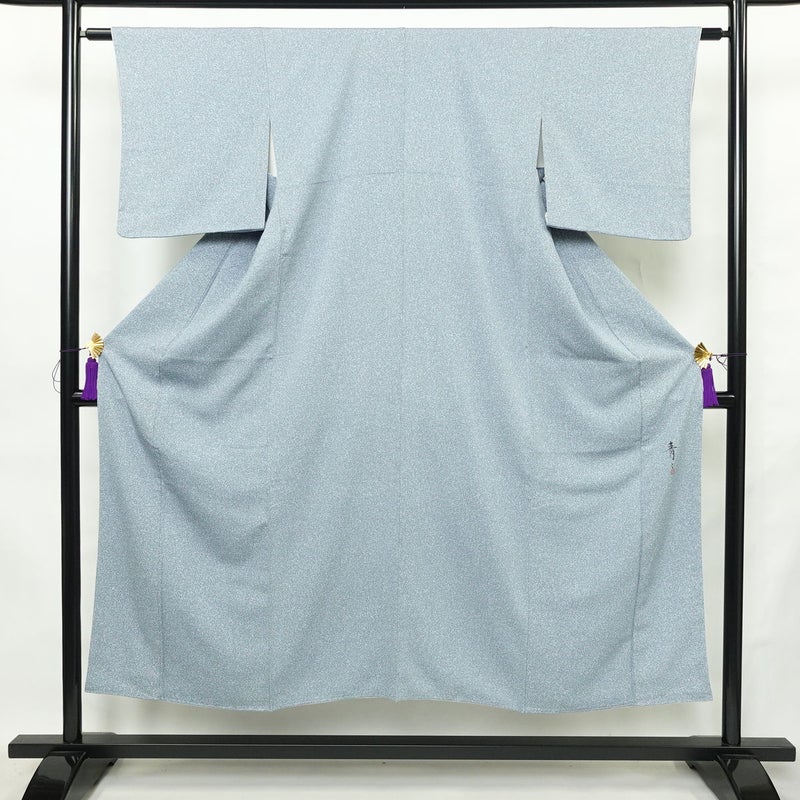 小紋 良品 松井青々 落款入り 縮緬 しつけ糸付き たたき染め 正絹 その他の柄 袷仕立て 身丈148.5cm 裄丈61.5cm リサイクル着物 着物 青・紺です。しなやかな風合いとなっております。