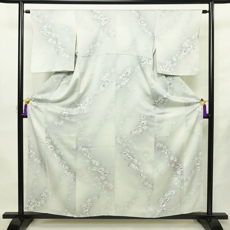小紋 正絹 花柄 袷仕立て 身丈157.5cm 裄丈62.5cm リサイクル着物 一部しつけ糸付き 着物 グレーです。心地よい風合いとなっております。