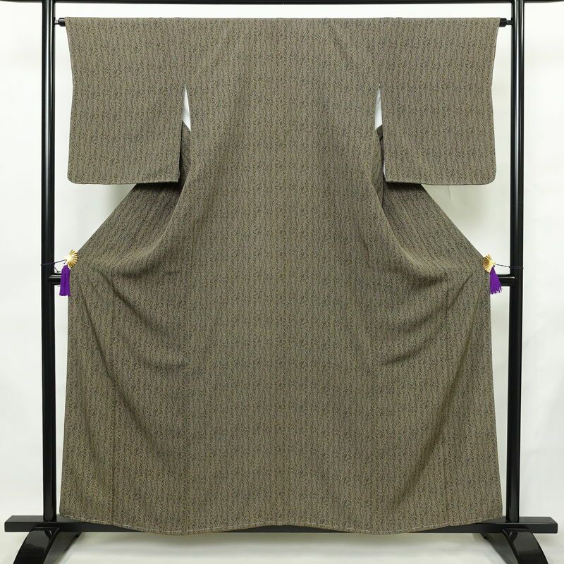 小紋 良品 しつけ糸付き 縮緬 正絹 木の葉・植物柄 袷仕立て 身丈157.5cm 裄丈64cm リサイクル着物 着物 緑・うぐいす色です。しなやかな風合いとなっております。