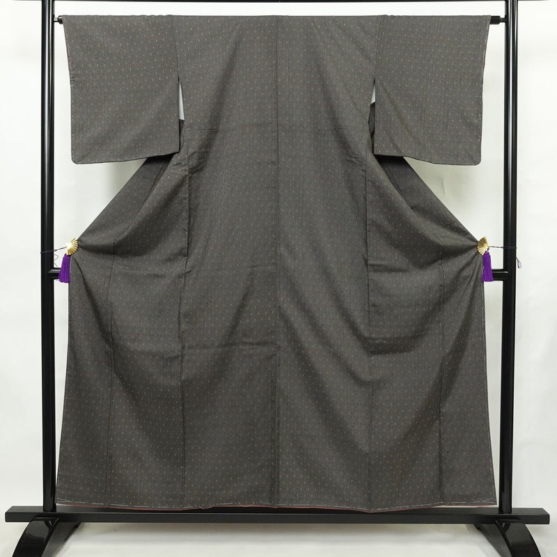 小紋 良品 しつけ糸付き 付下小紋 バチ衿仕立て 正絹 幾何学柄・抽象柄 袷仕立て 身丈156.5cm 裄丈64cm リサイクル着物 着物 モダン 紬地 グレーです。心地よい風合いとなっております。