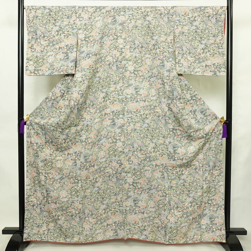小紋 縮緬 総柄 正絹 古典柄 袷仕立て 身丈164.5cm 裄丈67cm リサイクル着物 着物 緑・うぐいす色