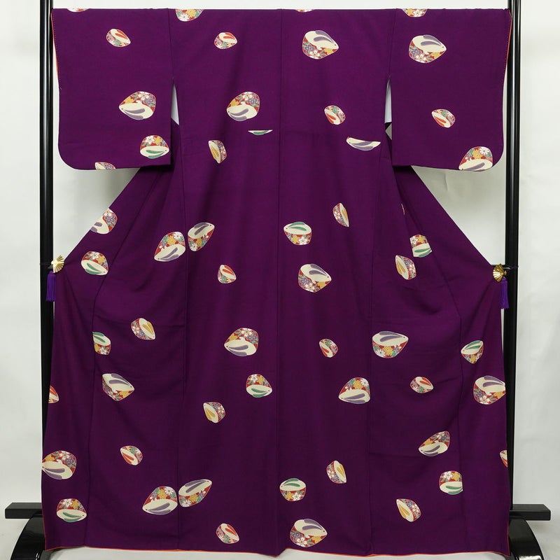 小紋 飛び柄 ポリエステル 古典柄 袷仕立て 身丈167.5cm 裄丈69cm リサイクル着物 着物 モダン 紫・藤色