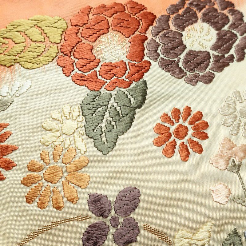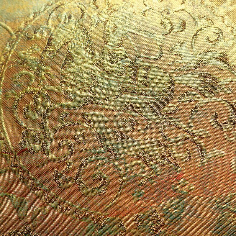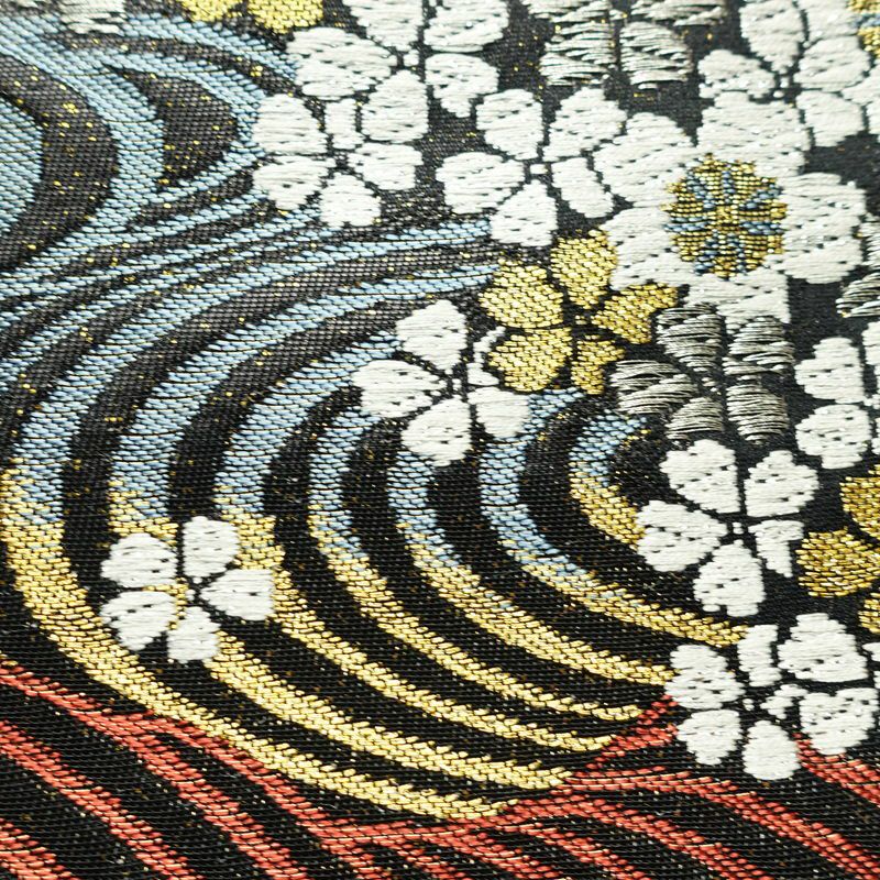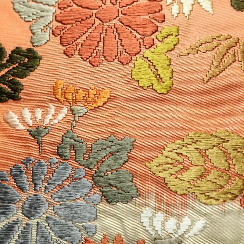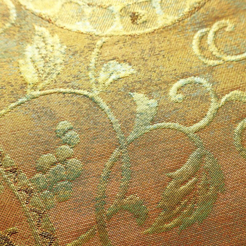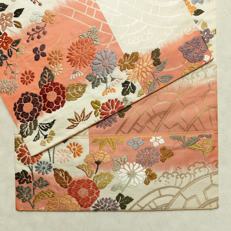 袋帯は、表地(柄)と裏地(無地)の両面を続けて袋状に織っていたことから付けられました。これは明治・大正期に儀式で用いられた丸帯の仕立てと似ています。