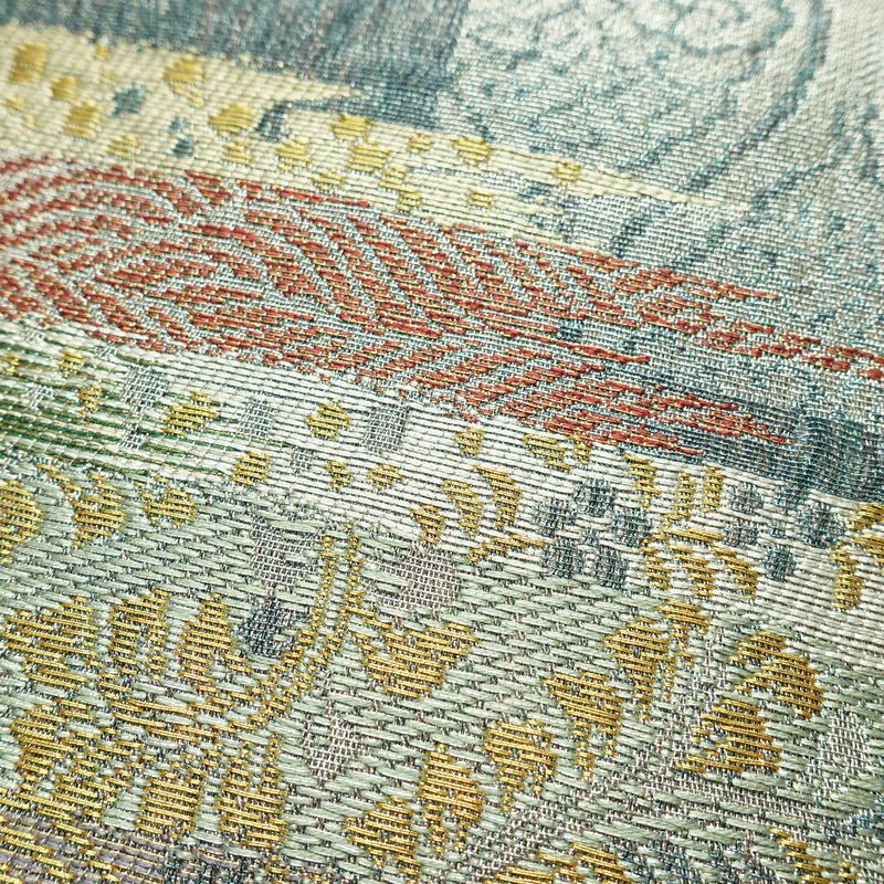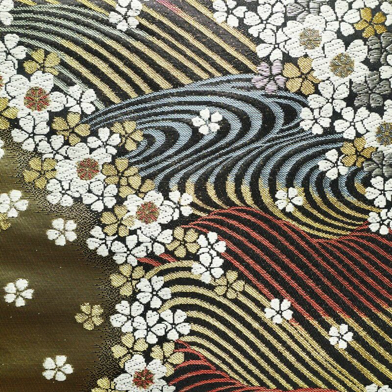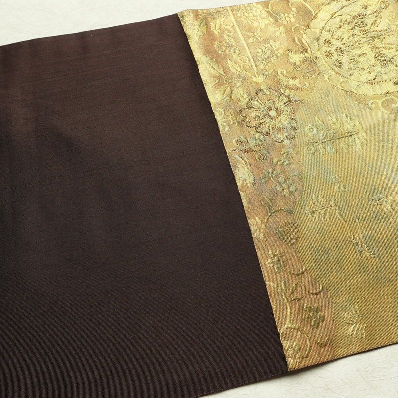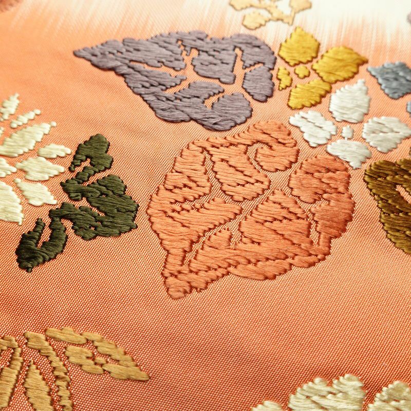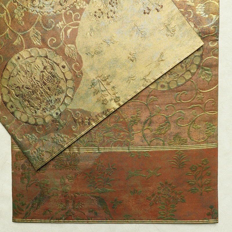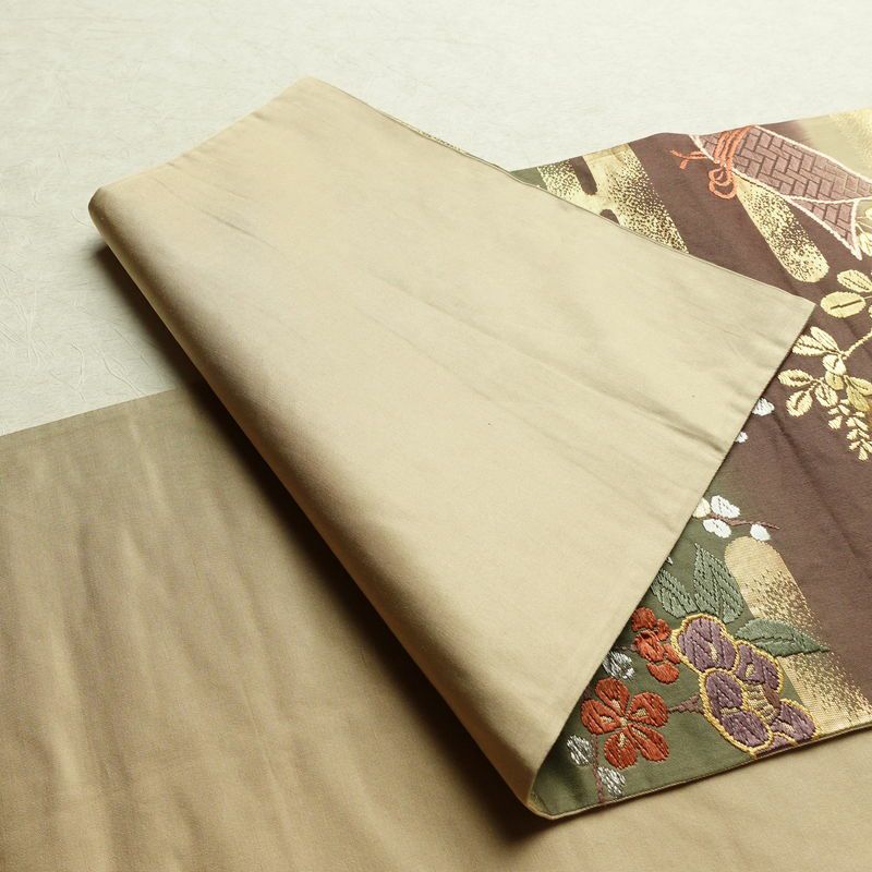 袋帯は、表地(柄)と裏地(無地)の両面を続けて袋状に織っていたことから付けられました。これは明治・大正期に儀式で用いられた丸帯の仕立てと似ています。