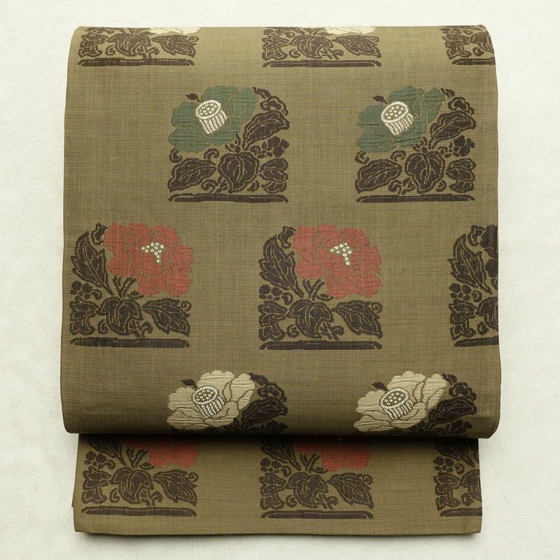 袋帯 六通柄 一般用 正絹 花柄 帯 緑・うぐいす色です。目のつまった手触りとなっております。
