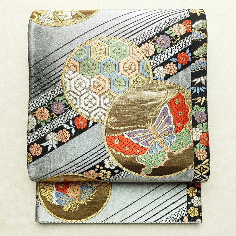 袋帯 六通柄 振袖用 正絹 蝶・昆虫柄 箔 金糸 帯 黒