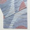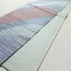 青・紺の正絹六通柄袋帯です。幾何学柄や抽象柄が美しく、パリッとした風合いが特徴です。フォーマルな場にふさわしい装いを提供します。