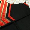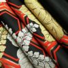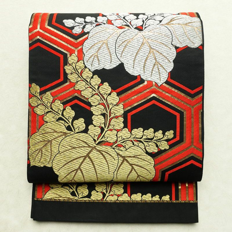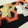 亀甲の古典柄が重厚感を漂わせる未仕立ての袋帯です。黒地に伝統的なデザインが映え、目の詰まった正絹の風合いが高級感を強調します。フォーマルなシーンにおいて落ち着いた品格を演出するのに最適です。