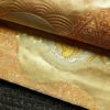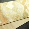 金・銀の箔が映える六通柄袋帯。幾何学柄・抽象柄の現代的なデザインがフォーマルな場で新鮮な印象を与えます。正絹素材の目のつまった風合いが高品質を感じさせ、入学式、卒業式、結婚式など特別な日の装いにぴったりです。