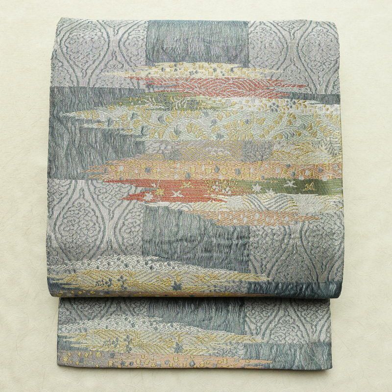 袋帯 六通柄 良品 フォーマル用 正絹 幾何学柄・抽象柄 リサイクル帯 帯 多色使いです。ざっくりとした風合いとなっております。