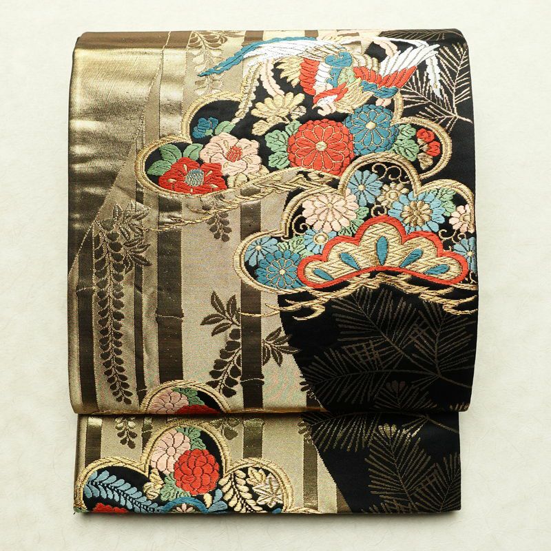 袋帯 六通柄 フォーマル用 正絹 古典柄 リサイクル帯 帯 引箔 金糸 結婚式 パーティー 華やか 松 黒
