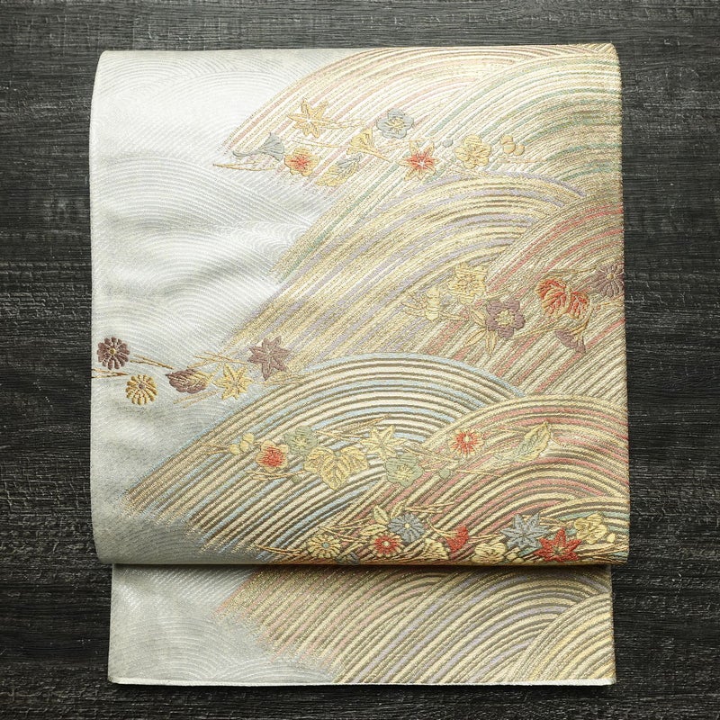 袋帯 彩詩観流文 玉かずら 六通柄 良品 フォーマル用 正絹 流水・波柄 リサイクル帯 帯 入学式 卒業式 七五三 お宮参り 金・銀です。ざっくりとした風合いとなっております。