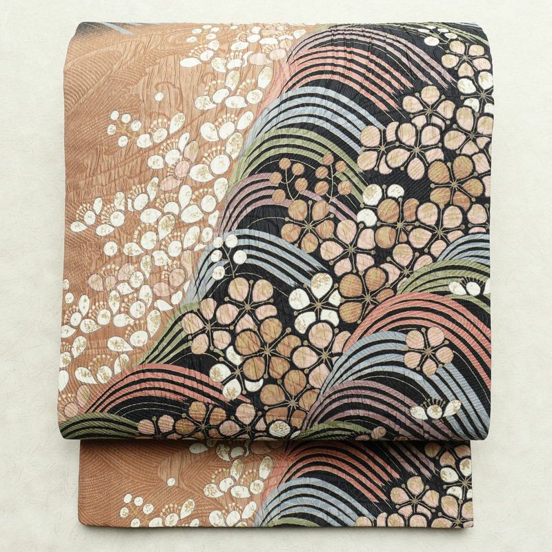多色使いの正絹全通柄袋帯です。流水や波柄が美しく、花柄が華やかさを引き立てます。気軽に着用できる風合いが特徴で、フォーマルな装いに最適です。