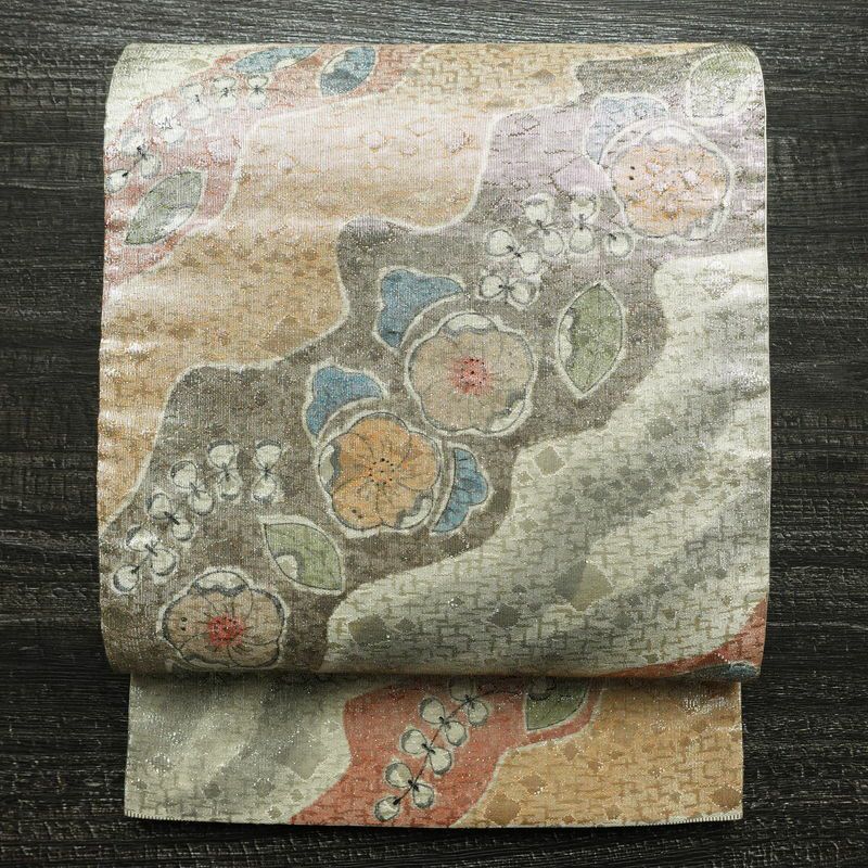 袋帯 太鼓柄 フォーマル用 正絹 木の葉・植物柄 箔 帯 金・銀です。ざっくりとした手触りとなっております。