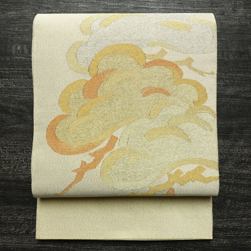 袋帯 太鼓柄 美品 つづれ織 フォーマル用 正絹 木の葉・植物柄 リサイクル帯 帯 入学式 卒業式 七五三 お宮参り シンプル 松 クリームです。ざっくりとした風合いとなっております。