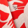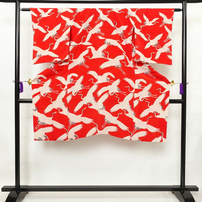アンティークの趣が魅力的な長襦袢。鶴のモチーフが繊細に描かれ、伝統的な美しさを際立たせます。赤・朱色の鮮やかな色彩が粋な雰囲気を演出し、しなやかな風合いが優雅な着用感をもたらします。