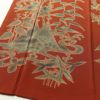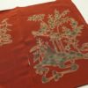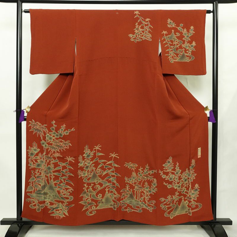 赤味のある茶地に風景柄を描いた宮内庁御用達・赤城右堂の付け下げです。正絹縮緬でしなやかな風合いがあり、一つ紋付きで格式も兼ね備えています。袷仕立て、落款入りでモダンな雰囲気も楽しめます。