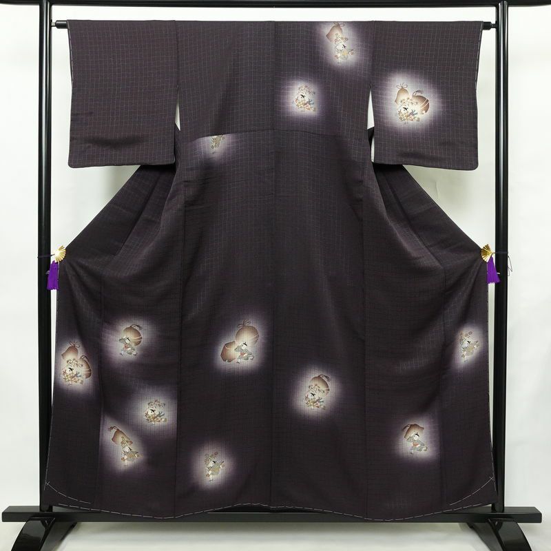 付け下げ 良品 しつけ糸付き 正絹 人物・動物柄 袷仕立て 身丈156cm 裄丈64cm リサイクル着物 着物 金彩 シンプル 紫・藤色です。しなやかな風合いとなっております。