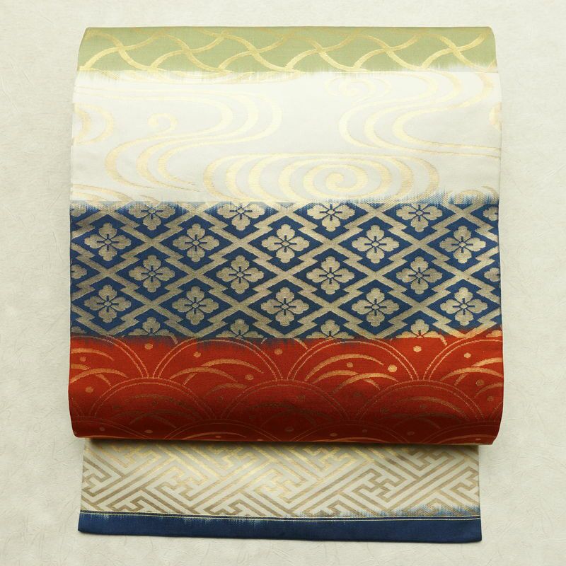 名古屋帯 六通柄 正絹 名古屋仕立て 箔 帯 露芝 流水 紗綾形 多色使い