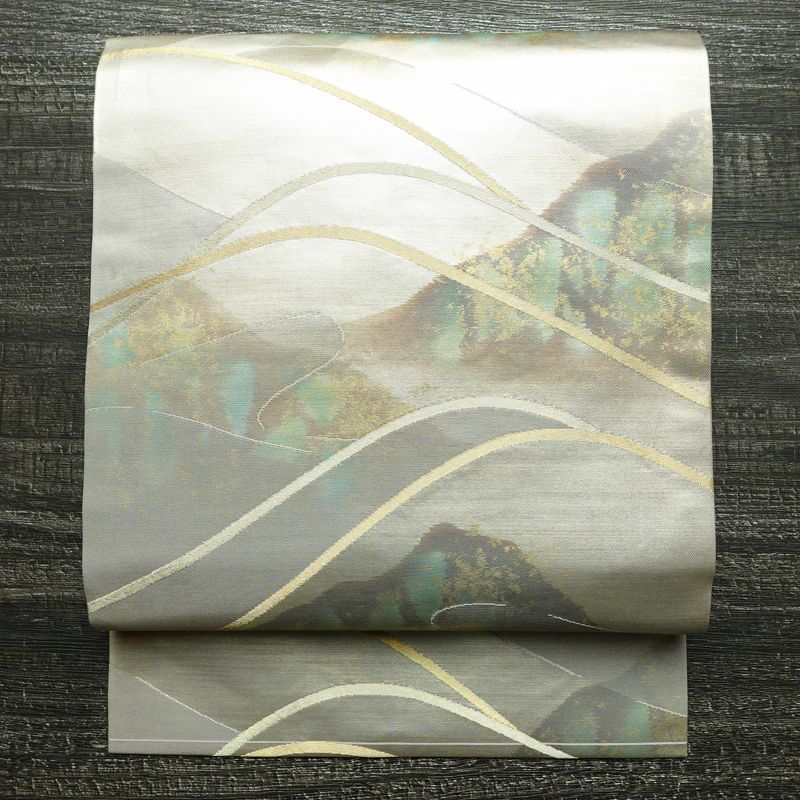名古屋帯 六通柄 正絹 風景柄 名古屋仕立て 箔 帯 紫・藤色