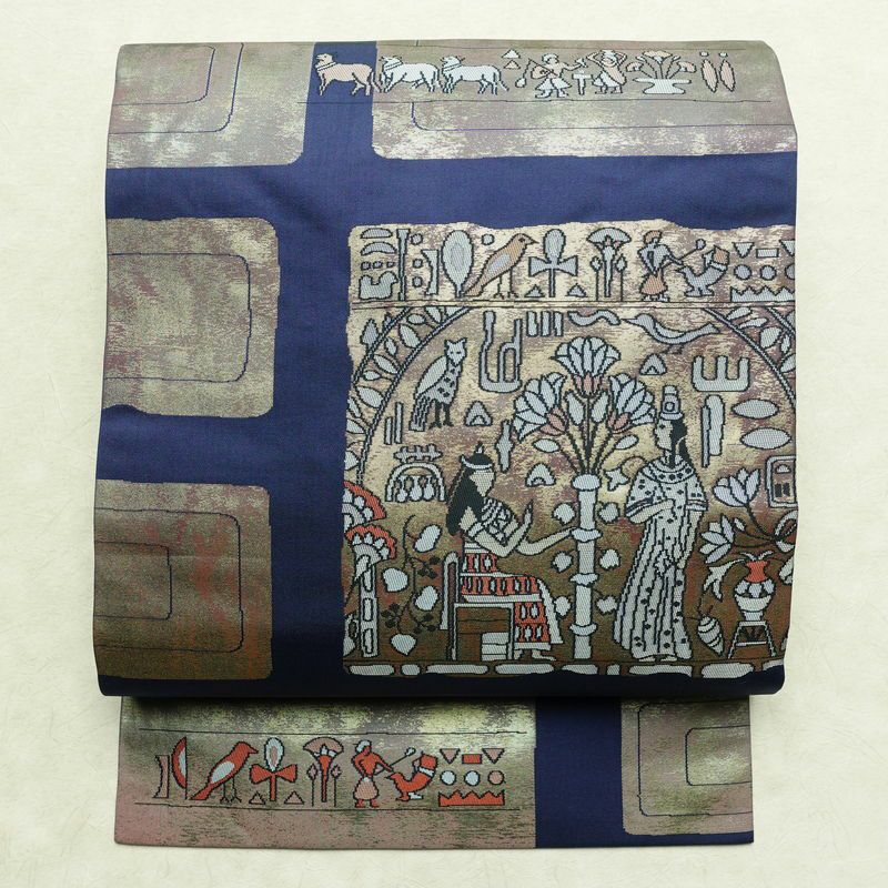 名古屋帯 六通柄 美品 正絹 人物・動物柄 名古屋仕立て 箔 帯 青・紺