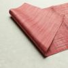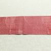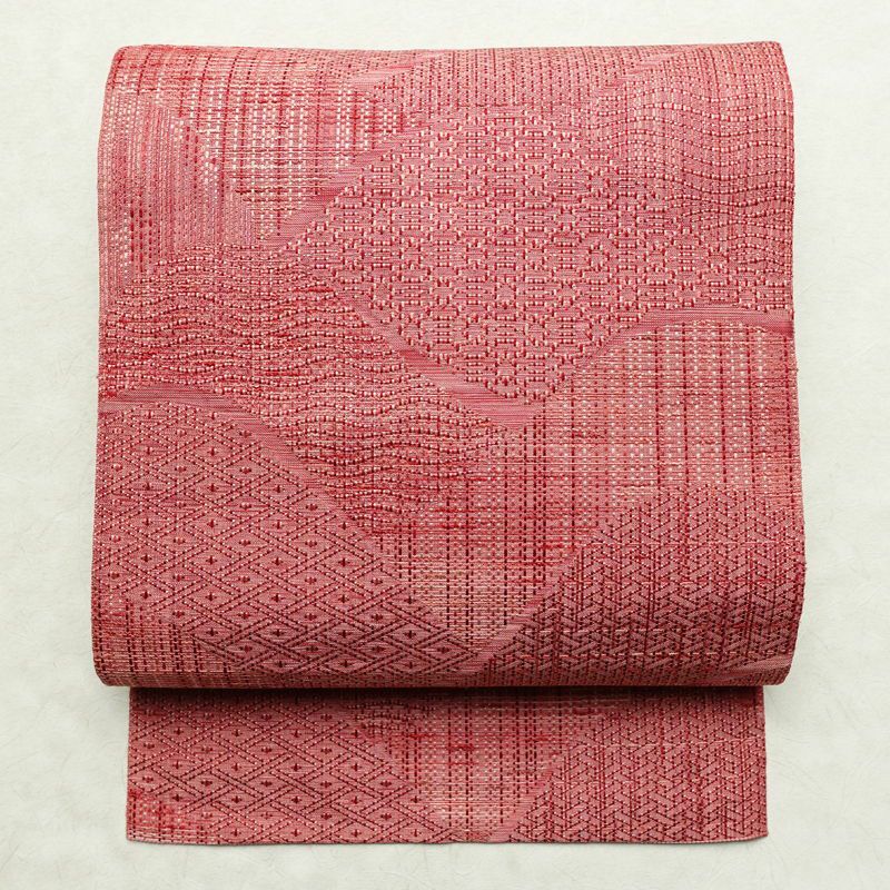 幾何学柄・抽象柄が華やかに描かれた六通柄の名古屋帯。ピンクの色調が優しさと上品さを兼ね備え、正絹素材のパリッとした風合いが装いを引き締めます。名古屋仕立てで端正な着こなしを実現し、特別なシーンに最適な一品です。