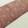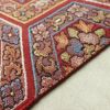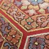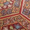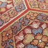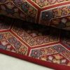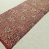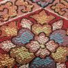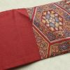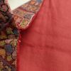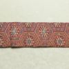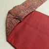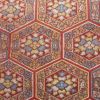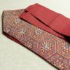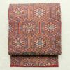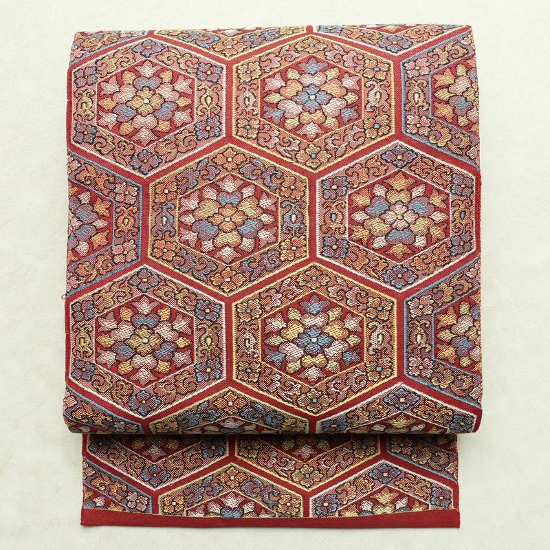 幾何学柄・抽象柄が斬新なデザインを形成する六通柄名古屋帯。赤・朱色の鮮やかな配色が装いに華やかさを添え、正絹素材の目のつまった風合いが高級感を提供します。名古屋仕立てで様々な場面で活躍する一品です。