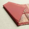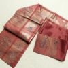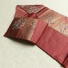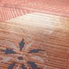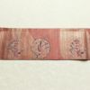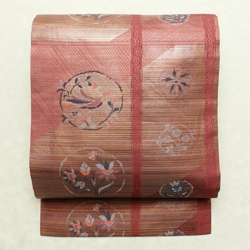 柔らかなピンク地に箔をあしらい、植物柄を描いた六通柄の名古屋帯です。心地よい正絹の風合いと名古屋仕立ての手軽さです。光を受けて優しく輝く箔が、女性らしさを引き立ててくれるデザインです。