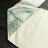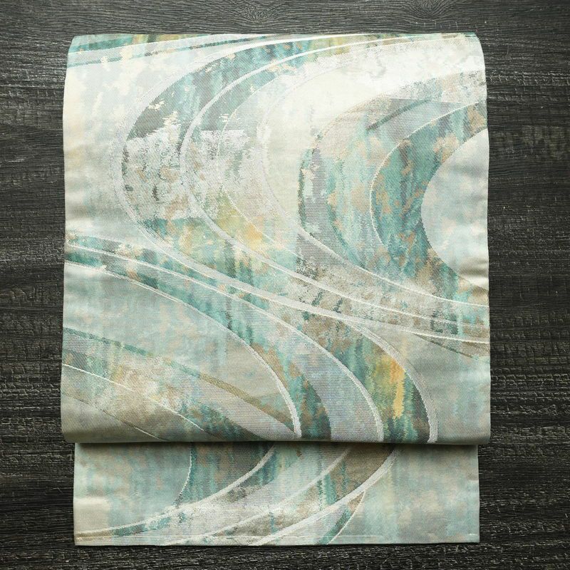 上品な色合いに流水や波柄を箔で織り込んだ正絹六通柄名古屋帯です。名古屋仕立てで心地よい風合いが魅力的で、爽やかな印象を与え和装に優雅さを添えます。