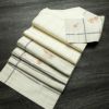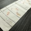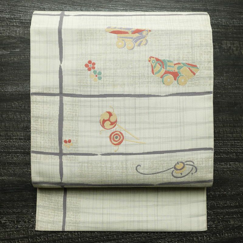 グレーを基調にした古典柄の六通柄名古屋帯で、さらりとした手触りが魅力的です。松葉仕立てで丁寧に仕上げられた帯は、落ち着いた色合いと上質な質感が、幅広い和装シーンに調和します。