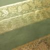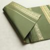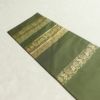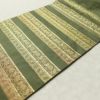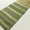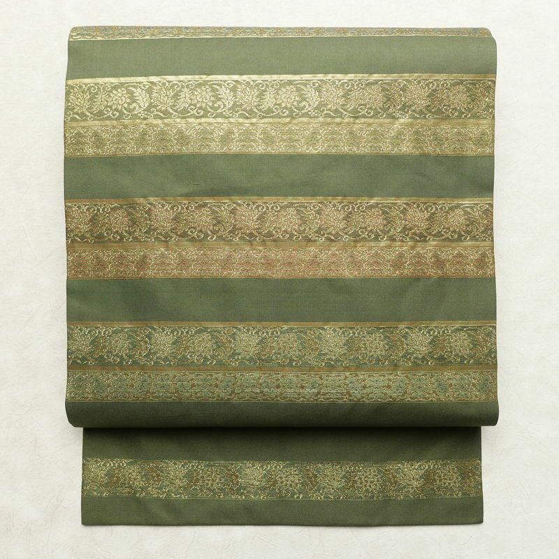 上品な色合いを基調に箔を用いた縞柄の六通名古屋帯です。正絹の張りのある風合いが美しい形を保ち、結びやすさも魅力です。モダンですが落ち着いた雰囲気が、和装に品格を与え、幅広く活躍します。リサイクル品ながら状態が大変良く、長く愛用できる一本です。