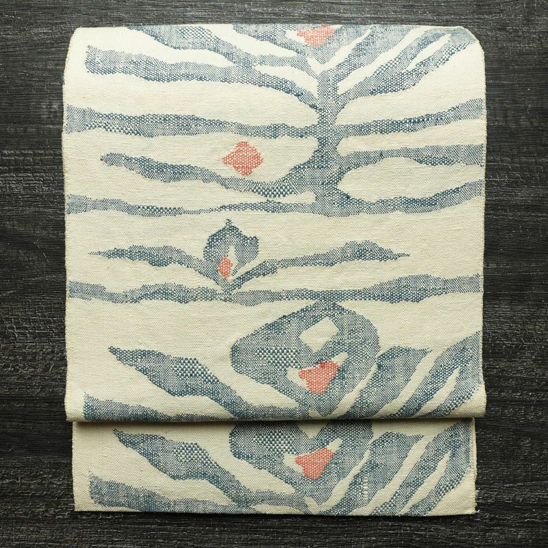 名古屋帯 六通柄 正絹 幾何学柄・抽象柄 通し仕立て なごや帯 リサイクル帯 帯 紬地 白です。ざっくりとした風合いとなっております。