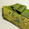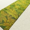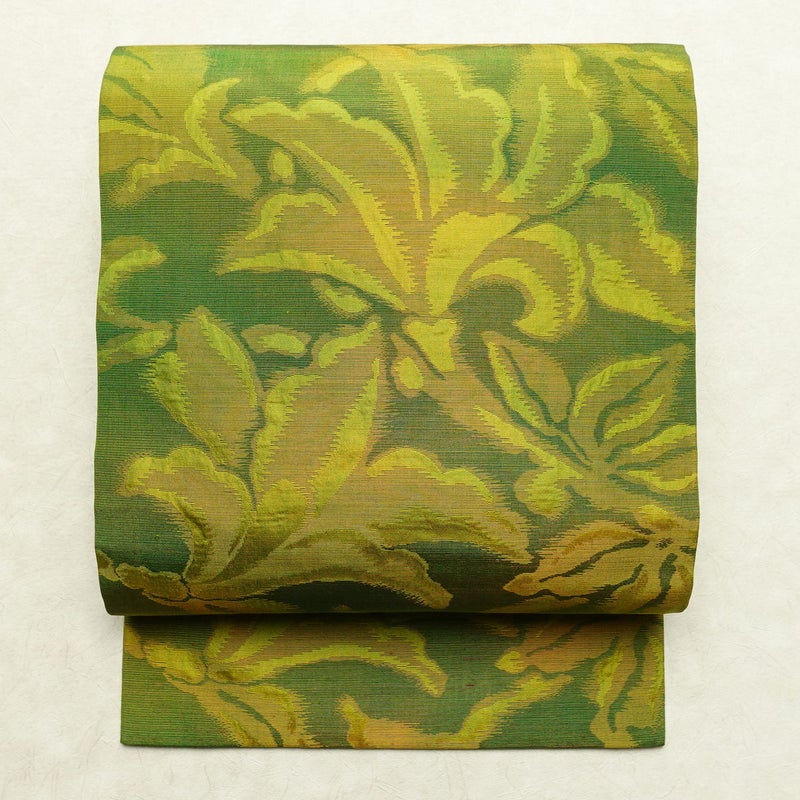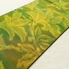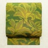 名古屋帯 六通柄 良品 正絹 木の葉・植物柄 名古屋仕立て なごや帯 リサイクル帯 帯 緑・うぐいす色です。心地よい風合いとなっております。