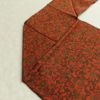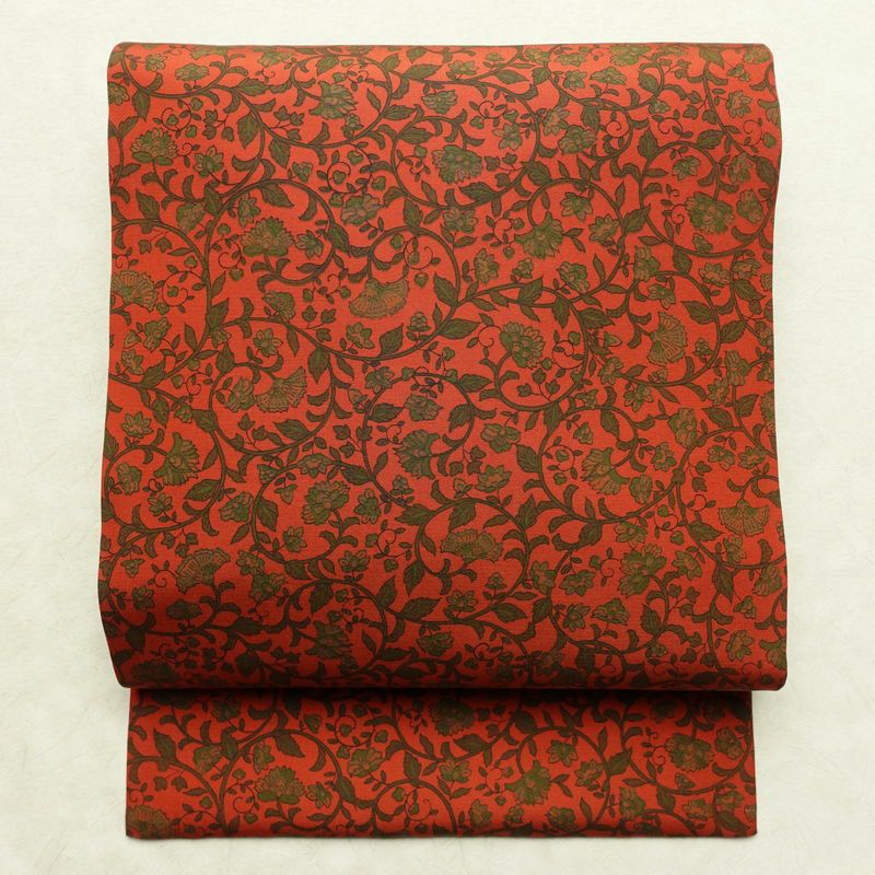 植物柄が赤地に映える、全通柄の名古屋帯です。正絹ならではのさらりとした質感で、締め心地も快適です。深みのある朱色が華やかすぎず、カジュアルな着物との相性も抜群。全体に柄が入っているため、巻き方に左右されず美しく決まります。状態も良好なリサイクル帯です。