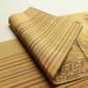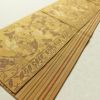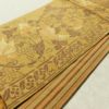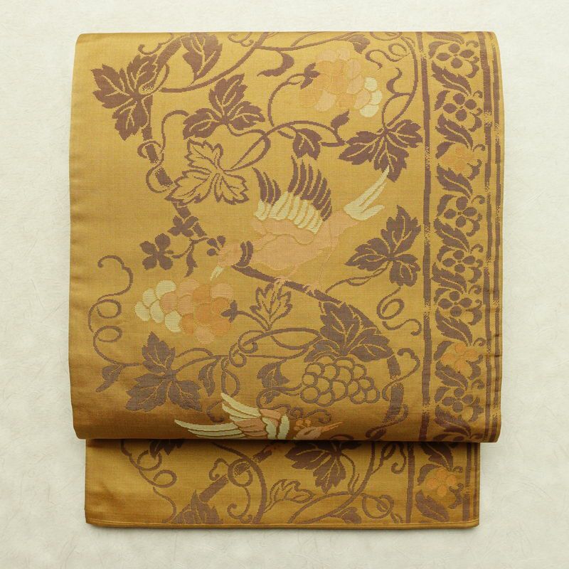 黄土色を基調に全通柄であしらった名古屋帯です。正絹ならではのさらりとした風合いが心地よく、模様が美しく映えています。落ち着いた色合いと自然のモチーフが和装に柔らかさを添えます。