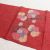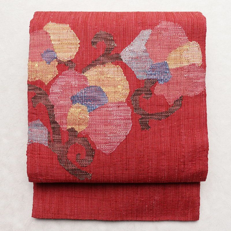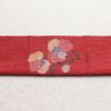 紬地の太鼓柄名古屋帯。正絹製の花柄が美しく、ピンクの帯が可愛らしさを演出します。松葉仕立てでざっくりとした風合いが特徴です。
