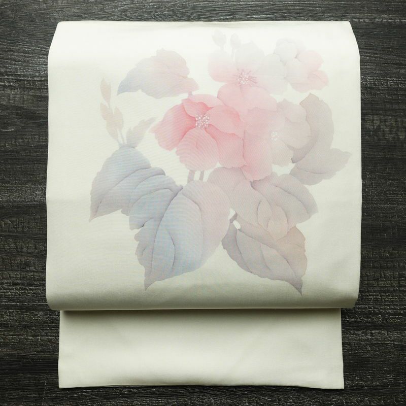 花柄が美しい名古屋帯。正絹素材と白の清潔感あふれる色合いが魅力です。しっかりとした風合いで、高級感があります。