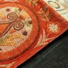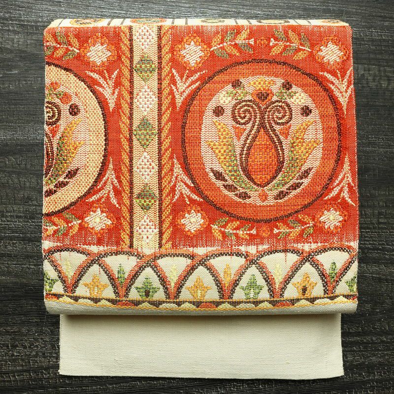幾何学柄と抽象柄が特徴的な正絹名古屋帯。紬地のざっくりとした風合いが、独特の個性とぬくもりを感じさせます。カジュアルな装いで幅広く活躍します。松葉仕立てで安定感のある着こなしを実現します。