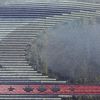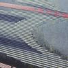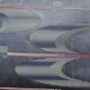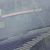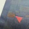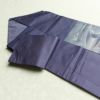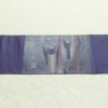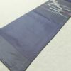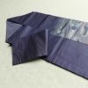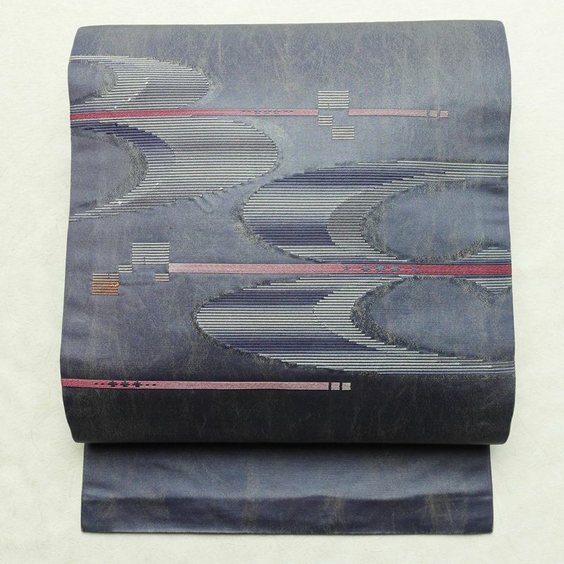 幾何学抽象柄がモダンな雰囲気を醸し出す正絹名古屋帯。箔がさりげなく光り、名古屋仕立てがしっかりとした安定感を提供します。紺系のシックな色合いと滑らかな風合いが洗練された装いに最適です。
