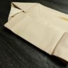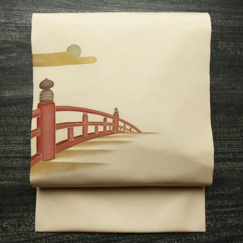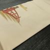 柔らかなベージュ地に引箔と金彩で描かれたさりげない風景柄が映える名古屋帯です。正絹の滑らかな質感が着姿に上品さを添えます。光の加減できらめく繊細な箔使いが印象的で、落ち着いた華やかさを演出します。